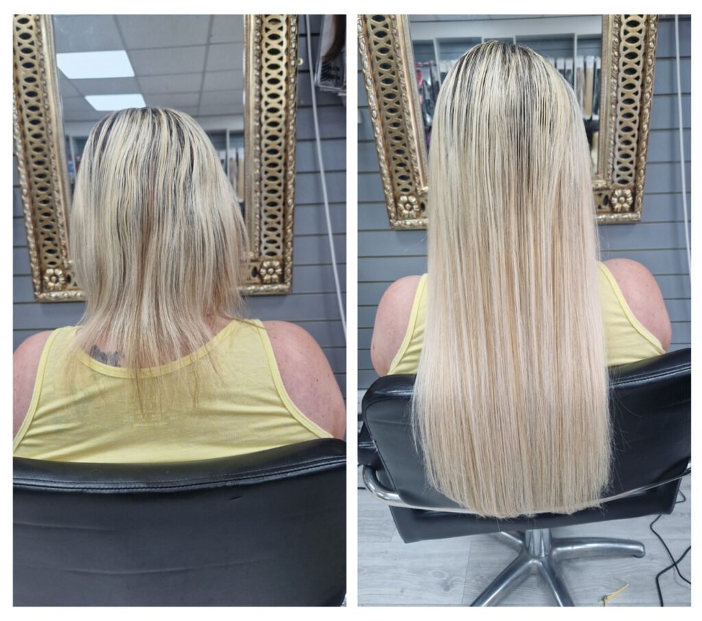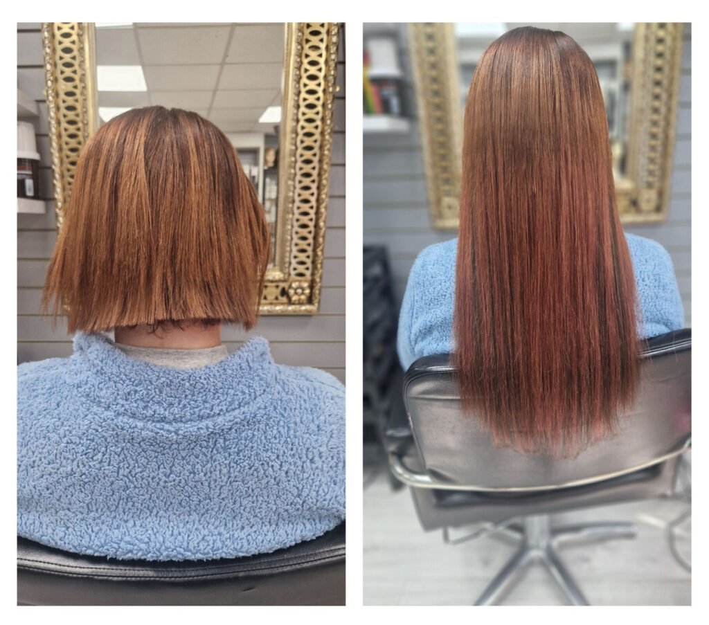Once you’ve chosen your extensions, it’s time for the application process. This is where the magic happens! Our skilled stylists will carefully apply the extensions, ensuring they blend flawlessly with your natural hair. The result? Instant length and volume that look and feel oh-so-natural. Look at the amazing results below.